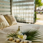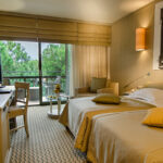 Standard (24 qm) im Hauptgebäude mit Bad, Bademantel, Fön, Telefon, SAT-TV, Minibar, Safe, Klimaanlage, Balkon, Meerblick (zum Teil seitlich) oder gegen Aufpreis Junior Suiten (35 qm) mit kleiner Sitzecke und Suiten (42 qm) mit getrenntem Wohn- und Schlafzimmer.