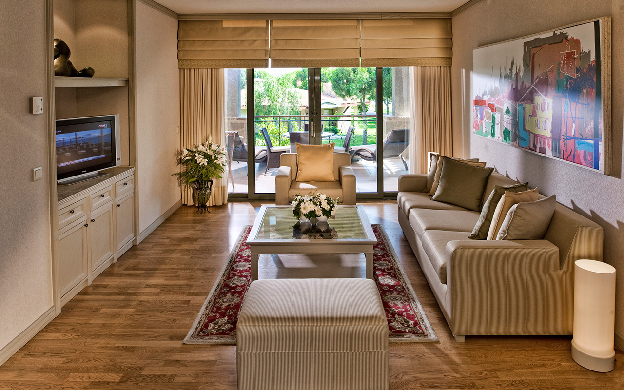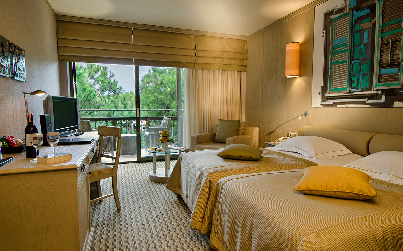 Standard (24 qm) im Hauptgebäude mit Bad, Bademantel, Fön, Telefon, SAT-TV, Minibar, Safe, Klimaanlage, Balkon, Meerblick (zum Teil seitlich) oder gegen Aufpreis Junior Suiten (35 qm) mit kleiner Sitzecke und Suiten (42 qm) mit getrenntem Wohn- und Schlafzimmer.