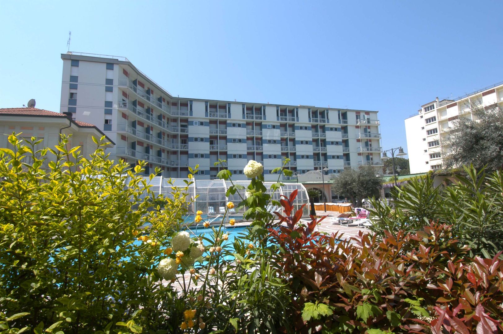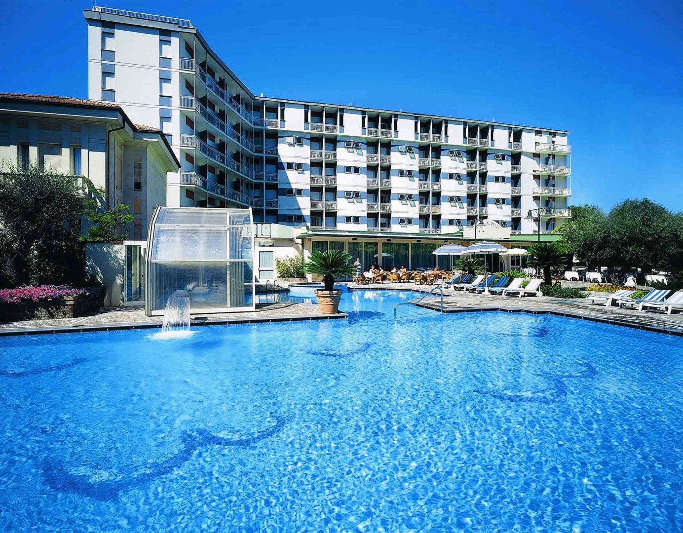 Dieses 4-Sterne Hotel in Milano Marittima liegt nur 30 Meter vom Strand entfernt. Das Zentrum können Sie bequem zu Fuß erreichen. Genießen Sie in warmherziger Gastfreundschaft einige unbeschwerte Tage und entspannen Sie am Meer oder im Wellness-Bereich. Nur wenige Autominuten entfernt liegt der 18-Loch Golfplatz Adriatic Golf Club Cervia.