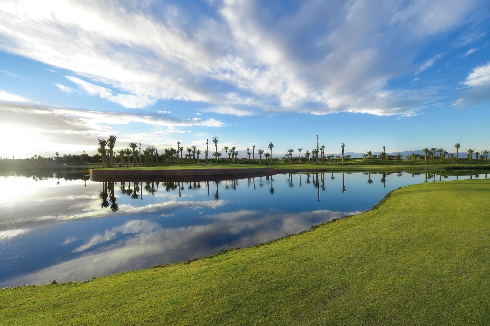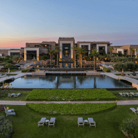 Das luxuriöse 5* Hotel Royal Palm liegt inmitten eines großzügigen Areals am Fuße des Atlas Gebirges nur ca. 12km von der lebendigen Altstadt von Marrakech entfernt. Sehr schön angelegte Gärten unter Olivenbäumen, majestätisch anmutende Berge, die sich im Hintergrund auftürmen und ein hervorragender Golfplatz durchzogen von kleinen Seen, prägen die prächtige Kulisse des Royal Palm.