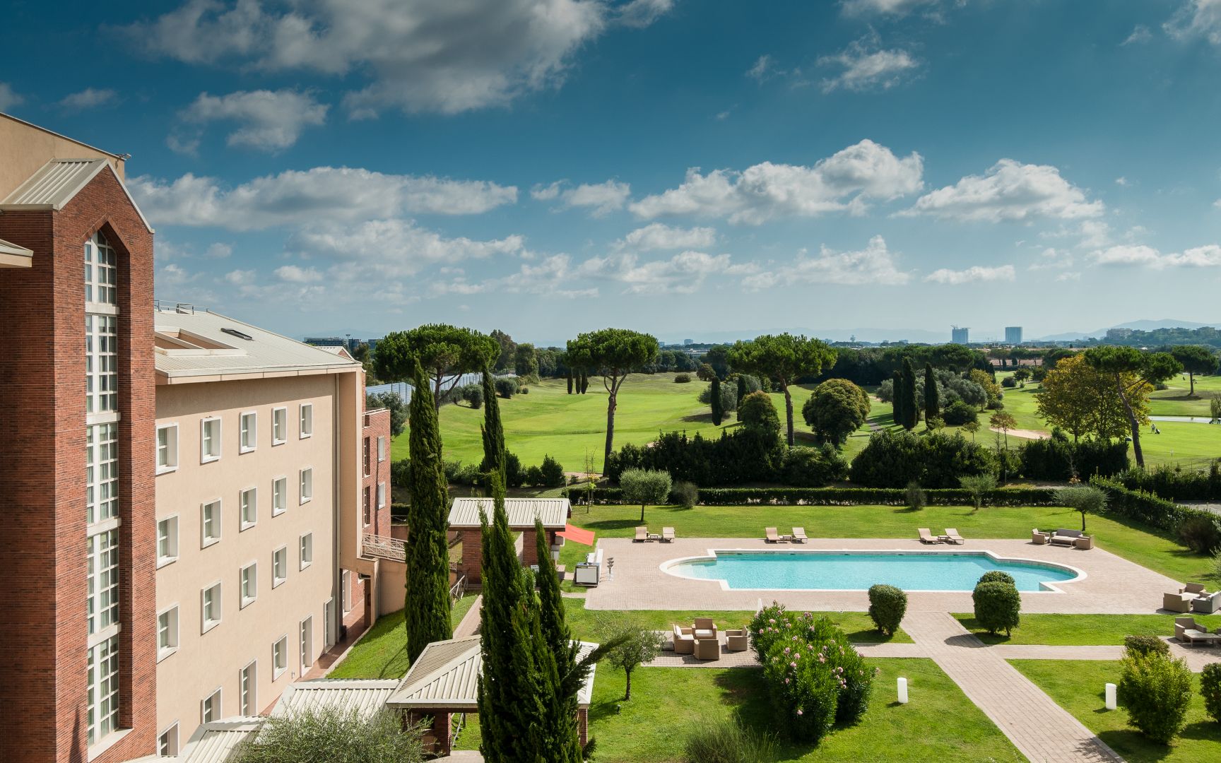 Das im Landhausstil gebaute Hotel Sheraton Parco de Medici liegt im Süden von Rom im belebten EUR Viertel in der Nähe der beiden Flughäfen. In der Nähe des Hotels befinden sich Einkaufsmöglichkeiten, Restaurants und Bars. Gegen Gebühr können Sie mit einem Shuttlebus in das Zentrum von Rom gelangen. Das Hotel verteilt sich auf ein Hauptgebäude und 2 Nebengebäude. Das Hotel bietet mehrere Restaurants, Bars und Cafés. In der schönen Gartenanlage gibt es einen Outdoor-Swimmingpool (Saisonal) mit Poolbar und Sonnenterrasse. Für Kinder gibt es einen Spielplatz und Kinderbetreuung. Das Hotel besitzt weiterhin ein Fitnessstudio, einen SPA Bereich, Sauna und Dampfbad (beides kostenpflichtig). Direkt am Hotel ist der 27-Loch Championship Golfplatz Parco de Medici. Ein kostenloser Shuttle auf dem Hotelgelände bringt Sie zum Golfplatz Der Flughafen Leonardo da Vinci befindet sich in ca. 15km Entfernung und der Flughafen Ciampino in ca. 19km Entfernung.